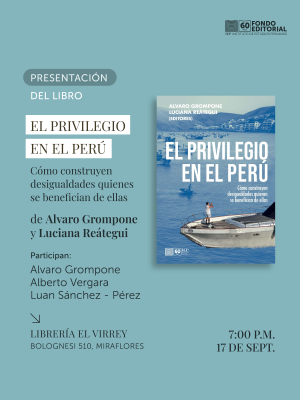 17 Sep 2025 Presentación del libro «El privilegio en el Perú» miércoles, 17 de septiembre 9/17/25 7:00 pm Librería El Virrey (Calle Bolognesi 510, Miraflores) Participan: Alvaro Grompone Alberto Vergara Luan Sánchez – Pérez